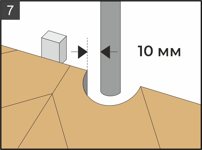 9.4. Соблюдайте ровность краев всего ряда. Укладывайте плашки с учетом зазоров 10 мм от всех стен и иных неподвижных сквозных конструкций (труб, дверных ограничителей, внутрипольных конвекторов и др.). Для расширения используйте монтажные (распорные) клинья (рис.7).